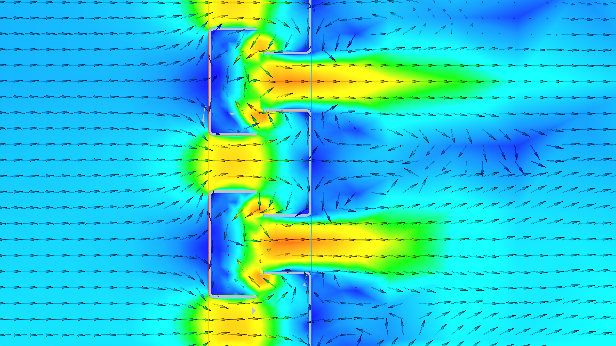 The picture right shows the fumes passing through our baffle filter, with the colours representing air speed. The dark blue is the slowest whist the red/orange is the fastest. As the fumes make their way through the baffles there are points where the airflow sharply changes direction, this action throws the grease from the airstream which drains down the channels.