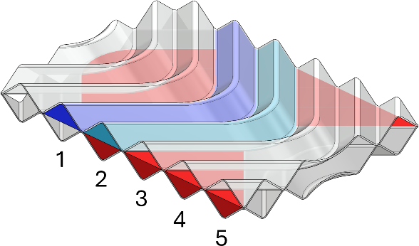 The fumes (blue) enter the first (1) opening & winds its way through the ‘V’ shaped channel. This path intersects with four underlying channels (2-5) where the ‘V’ direction is reversed (in red). The air splits into these channels which carries into other channels also (cyan). This effect is repeated 40,000 times per square metre.